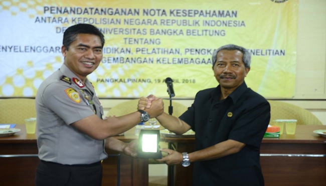 Penandatanganan MoU antara kedua institusi itu dihadiri Kapolda Bangka Belitung Brigjen Pol Drs Syaiful Zachri MM dan staf polda. MoU mencakup tentang penyelenggaraan pendidikan, pelatihan, pengkajian, penelitian dan pengembangan kelembagaan.