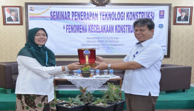 Wakil Rektor 1 UBB Dr. Ir. Ismed Inonu, MSi., menyerahkan pelakat kepada Martalia Isneini, ST., ME., selaku Kepala Seksi Pengembangan Teknologi Konstruksi, Balai Penerapan Teknologi Konstruksi, diacara seminar Penerapan Teknologi Kontruksi, bertempat ruang aula Gedung Babel 4 Kampus Terpadu UBB.