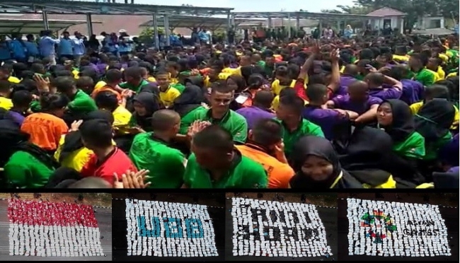 Selain formasi giant flang merah putih, mahasiswa baru ini juga membentuk 3 formasi giant flang lainnya. Dengan mengangkat potongan kardus yang telah dilapisi kertas manggis berbagai warna, mereka secara bergantian membentuk formasi yang bertuliskan UBB, Anti Hoax, dan logo ASEAN Games.
