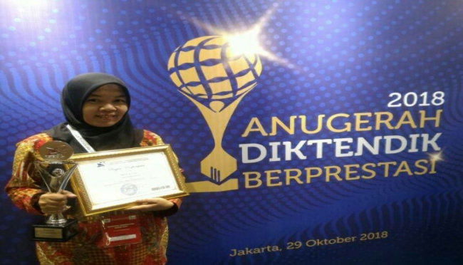 FOSE TERBAIK -- Nelly Gusnita (38), memegang tropi dan piagam penghargaan sebagai juara 2 kategori pengelola keuangan terbaik perguruan tinggi se Indonesia, berfose di depan ‘back drop’ Anugerah Diktendik Berprestasi Tahun 2018 yang berlangsung di Hotel Haris Vertu, Jakarta, Senin (29/10/2018) malam.