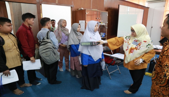 Test Center UTBK UBB – Hari pertama sesi pagi, Pengawas ruangan UTBK UBB melakukan pengecekan fisik dengan alat metal detector kepada para peserta UTBK gelombang 1, bertempat di Laboraturium Bahasa Gedung Timah I, Kampus Terpadu UBB, Sabtu (13/4) pagi.