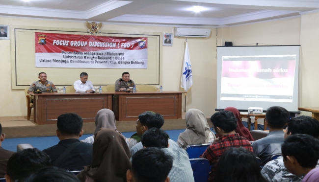 FGD menghadirkan dua narasumber dari Polda Kepulauan Bangka Belitung. Dua narasumber tersebut, yakni Kasubdit Polmas Polda Bangka Belitung Kompol Bim Rekoaji SE dan Aipda Miryawansyah SH SPd I. Kegiatan yang dihadiri kurang lebih 100 Mahasiswa UBB itu diselenggarakan di Ruang Rapat Besar Rektorat UBB, Selasa (23/04/2019) Pagi.