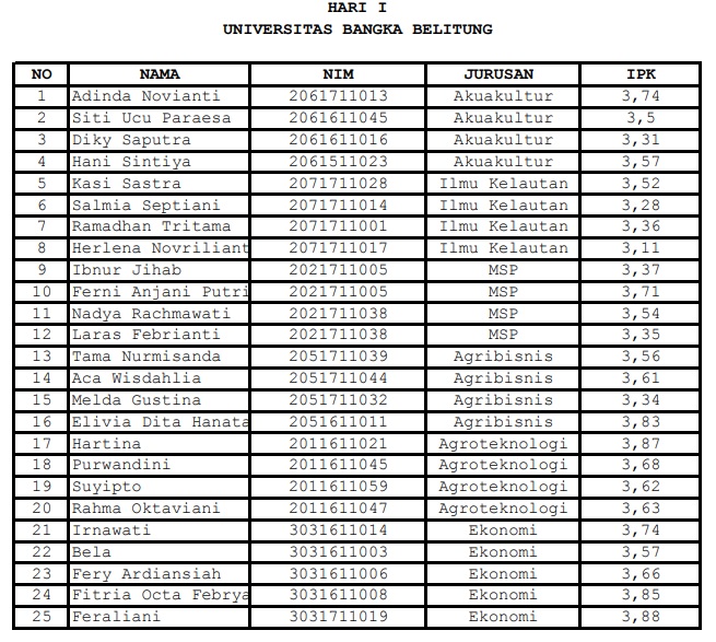 Daftar Nama Calon Penerima Beasiswa Bank Indonesia Untuk Wawancara Pada Hari Kamis Tanggal 2 Mei 2019 Kantor Bank Indonesia Provinsi Babel Lantai 4.