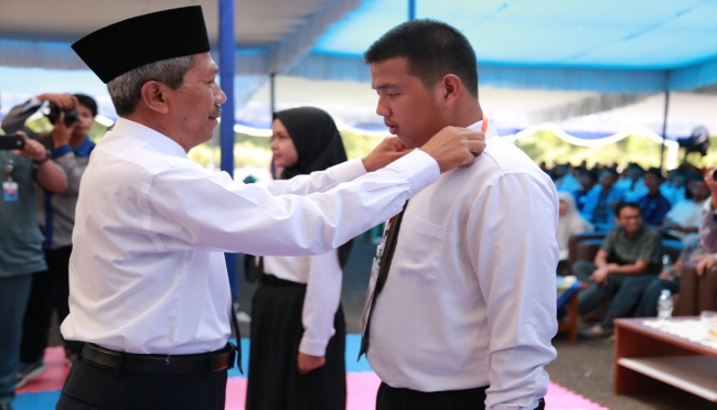 PKKMB 2019 - Rektor UBB Dr. Ir. Muh Yusuf, MSi., penyematkan tanda peserta PKKMB Tahun 2019 secara simbolis kepada perwakilan mahasiswa baru di acara pembukaan PKKMB, Senin (12/8).