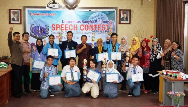Pemenang Speech Contest UBB 2019 melakukan foto bersama Kepala UPT Bahasa UBB dengan para juri, panitia, dan guru pendamping.