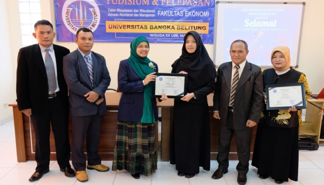 Dalam acara itu pula, Dekan FE UBB Dr. Reniati, SE., MSi., memberikan penghargaan kepada dua wisudawan dengan lulusan terbaik. Salah satu wisudawan lulus dengan predikat Pujian, Catherine dari Jurusan Akuntansi tidak bisa hadir di penyerahan penghargaan tersebut, sehingga penghargaan diwakili oleh Ketua Jurusan Akutansi.