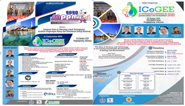 Berdasarkan afiliasi peserta maka kegiatan ICoGEE dan SNPPM telah memenuhi syarat penyelenggaraan seminar internasional dan seminar nasional, yang turut menambah optimisme Fakultas Teknik UBB untuk tetap menyelenggarakan kegiatan ini yang dijadwalkan pada 8 Oktober 2020 nanti.