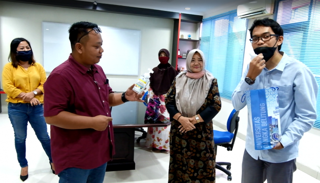 Pemimpin Redaksi Bangka Pos Ibnu Taufik Juwarianto memberikan apresiasi mengenai produksi handsanitizer buatan mahasiswa ini. Ia memuji UBB karena sudah bisa mengembangkan handsanitizer dengan ekstrak bahan alami.