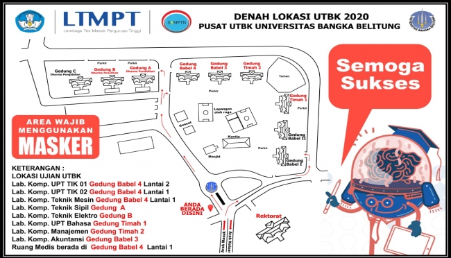 Kepada Peserta UTBK tahun 2020 agar melihat lokasi UTBK satu hari sebelum pelaksanaan UTBK, berikut lokasi UTBK di Universitas Bangka Belitung dan SMK Negeri 1 Tanjung Pandan tahun 2020 :