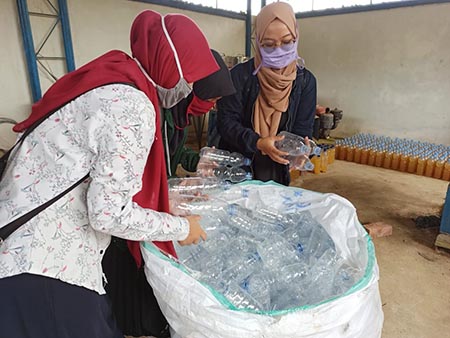 KEMASAN BOTOL -- Mahasiswa KKN UBB Batin Tikal memilih botol plastik yang sudah dibersihkan untuk kemudianh diisi POC hasil dari fermentasi bahan organik sampah Pasar Pagi Pangkalpinang.
