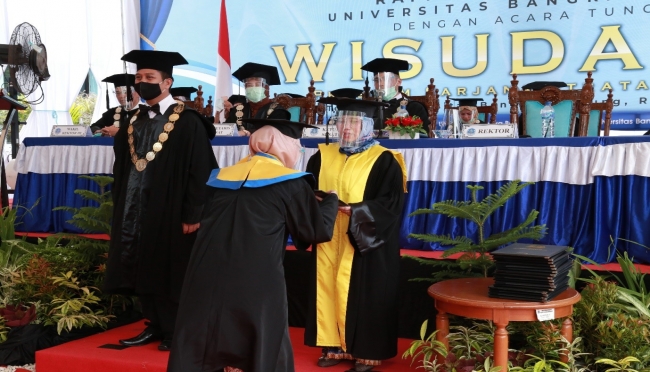 Penyerahan ijazah dan pemindahan kuncir, serta pemberian ucapan selamat kepada wisudawan tanpa berjabat tangan, saat prosesi Wisuda UBB Angkatan XXI dengan protokol kesehatan covid-19 ketat.